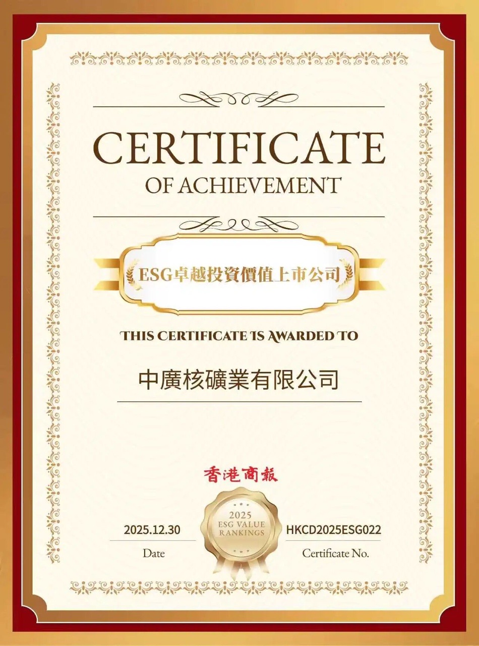 日前,由《香港商報(bào)》主辦的“2025年度上市公司卓越ESG價(jià)值榜”頒獎(jiǎng)典禮在香港灣仔隆重舉行。中廣核礦業(yè)憑借在環(huán)境、社會(huì)與管治(ESG)領(lǐng)域的優(yōu)異表現(xiàn),獲評(píng)“ESG卓越投資價(jià)值上市公司”。本屆評(píng)選由《香港商報(bào)》聯(lián)合專業(yè)機(jī)構(gòu)發(fā)起,旨在挖掘港股市場(chǎng)中積極履行社會(huì)責(zé)任、具備長(zhǎng)期增長(zhǎng)潛力的標(biāo)桿企業(yè)。香港特區(qū)政府、金融監(jiān)管機(jī)構(gòu)、資本市場(chǎng)專家及相關(guān)行業(yè)代表出席活動(dòng),為獲獎(jiǎng)企業(yè)頒發(fā)證書(shū)。此次獲評(píng)“ESG卓越投資價(jià)值上市公司”獎(jiǎng)項(xiàng),不僅是權(quán)威媒體對(duì)中廣核礦業(yè)ESG治理水平的認(rèn)可,更是對(duì)其投關(guān)價(jià)值與ESG實(shí)踐深度融合的肯定。